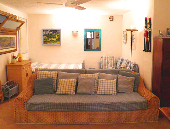 Il piano seminterrato è composto da ingresso, 1 camera matrimoniale, 2 bagni con doccia, ampio soggiorno con 3 divani letto, cucina, e un'ulteriore piccola camera singola. Tutte le camere dispongono di finestre e ventilatore a soffitto.